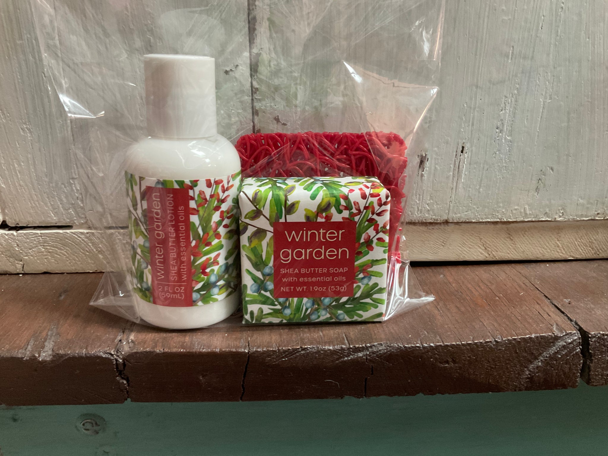 French-milled, luxurious vegetable soaps and lotion enriched with shea butter, essential oils & natural extracts in captivating botanical scents. Paper-wrapped and offered in a 1.9oz mini soap square, 2 fl oz lotion, and mini soap saver square