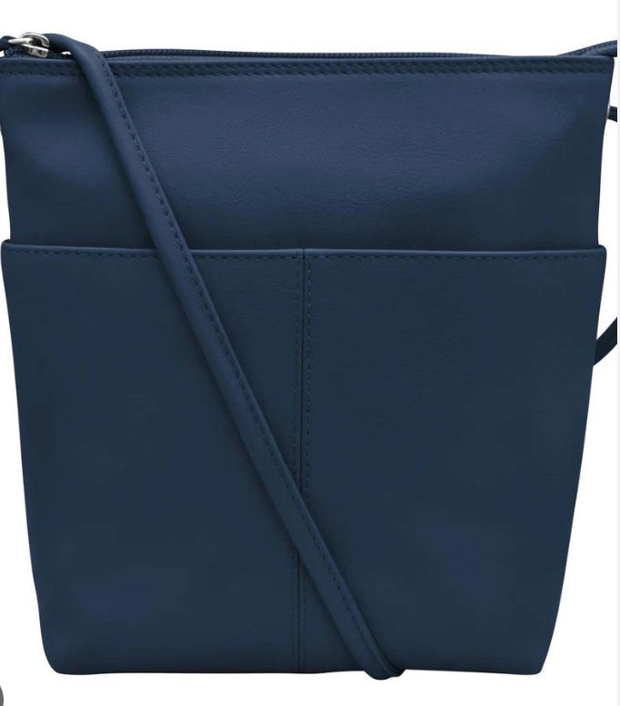 Adjustable strap can be knotted and shortened to any length. Front slip pocket and back zip pocket. Inside. I’m pocket. Strap drops to 22”.