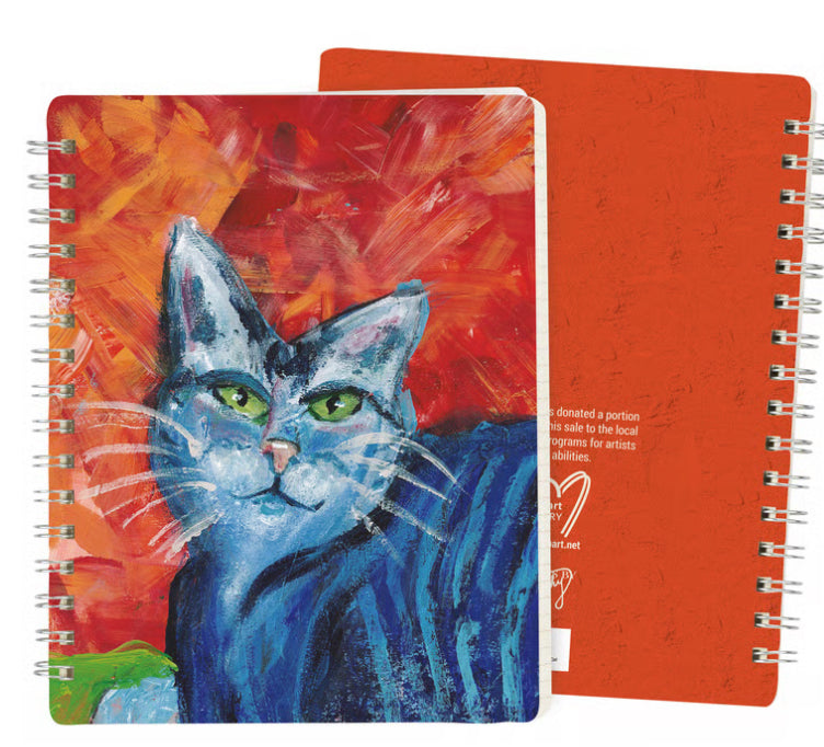 A double-sided spiral notebook from our Friendship Heart Gallery Collection displaying a uniquely hand painted scene of a colorful cat. Cat design is replicated from original art created at the Friendship Heart Gallery in downtown Lancaster, PA that supports artists with intellectual disabilities and autism. Our spiral Colorful Cat notebook includes 120 lined pages. A pet-themed gift perfect for an everyday accessory.
