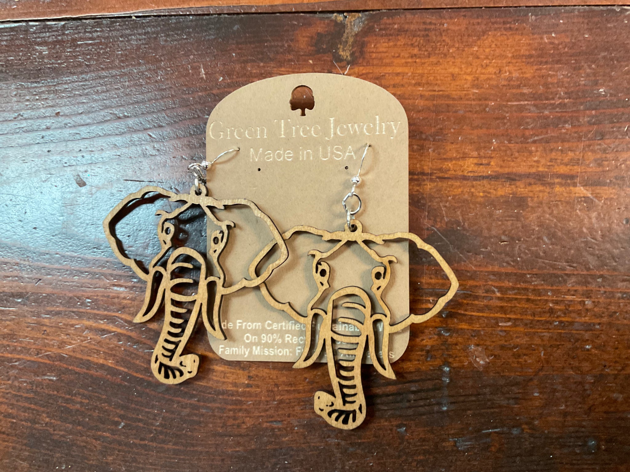 Green Tree Jewelry is made in the USA and uses certified sustainable wood. The earrings are on 90% recycled cards.