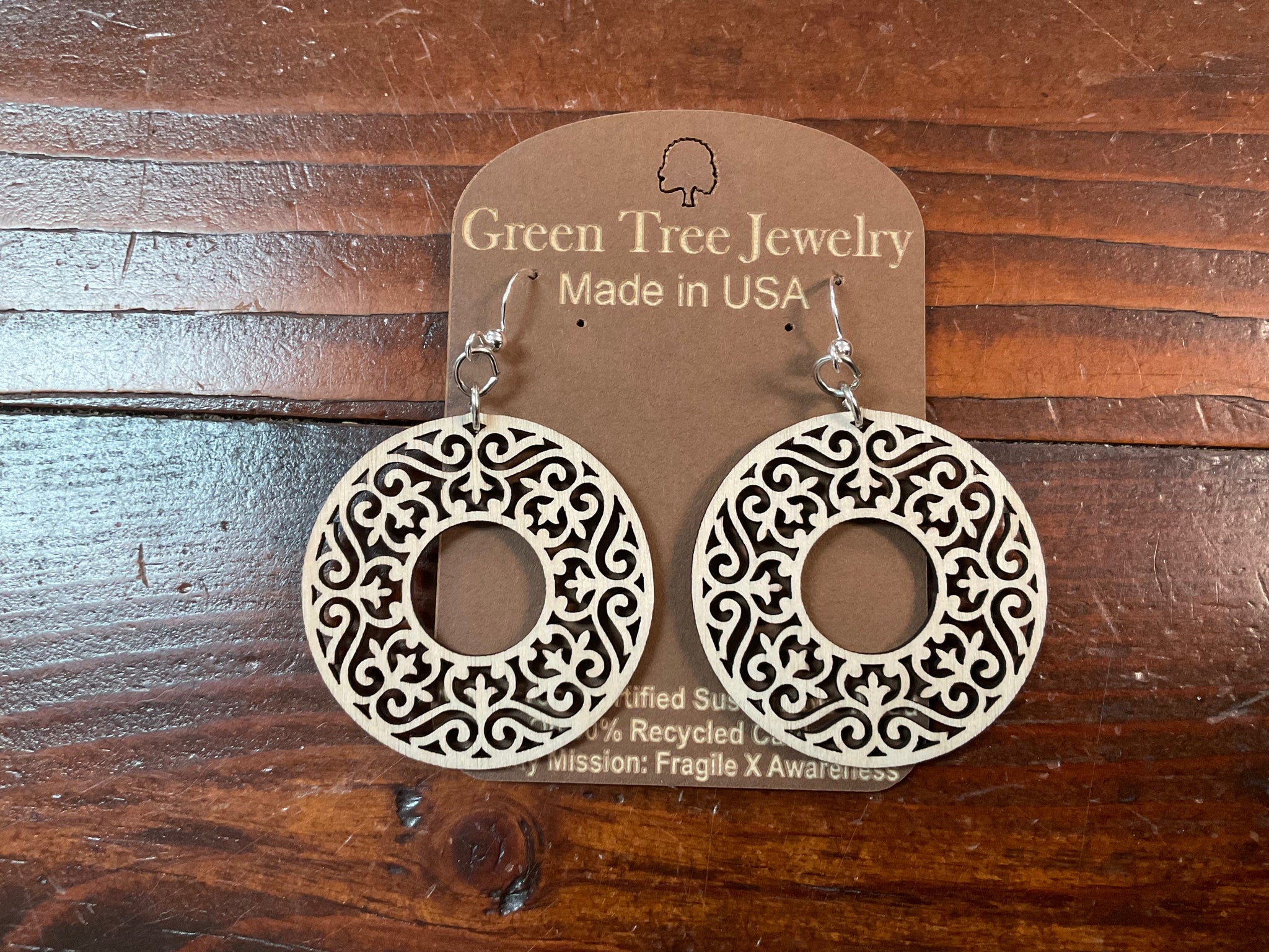 Green Tree Jewelry is made in the USA and uses certified sustainable wood. The earrings are on 90% recycled cards.