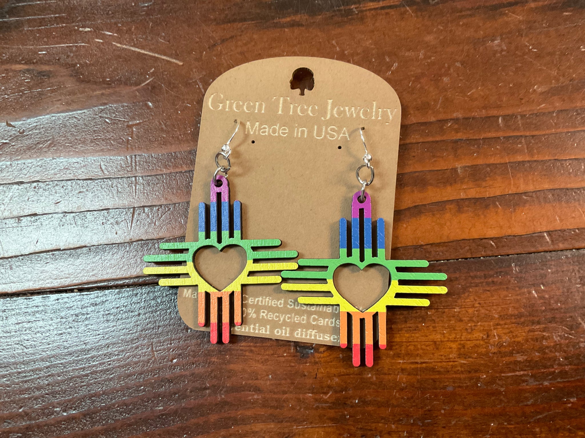Green Tree Jewelry is made in the USA and uses certified sustainable wood. The earrings are on 90% recycled cards.