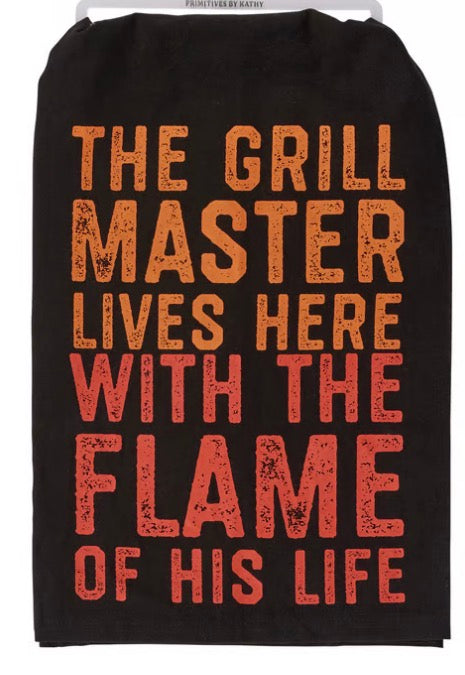 A black cotton kitchen towel from our Grilling & Chilling Collection displaying a fun grilling inspired sentiment with distressed details that reads "The Grill Master Lives Here With The Flame Of His Life." Our Grill Master kitchen towel is conveniently machine-washable for easy cleaning. A fun grill-themed gift perfect for everyday use.