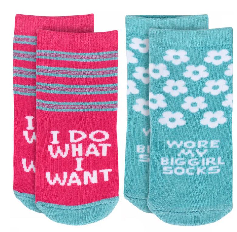 Two pairs of cozy baby socks in a giftable set from our Baby & Kids Collection displaying fun and colorful designs on each pair. Baby sock designs feature a stripe pattern with sassy sentiment that reads "I Do What I Want" as well as a pattern of flowers with a fun sentiment that reads "Wore My Big Girl Socks." Socks are sized to fit a 0-12 month baby and made with a cotton, nylon, and spandex blend for a snug fit. Our I Do What I Want baby sock set comes with a header card and a clear plastic hanger displaying both sock designs for easy rack display. A fun gift for baby showers or everyday moments.